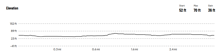 this graph shows the elevation change of the race as you complete the 5k. at the top right of the graphic it shows the starting elevation(52ft), the max elevation(63ft),and the gain of elevationh(9ft).